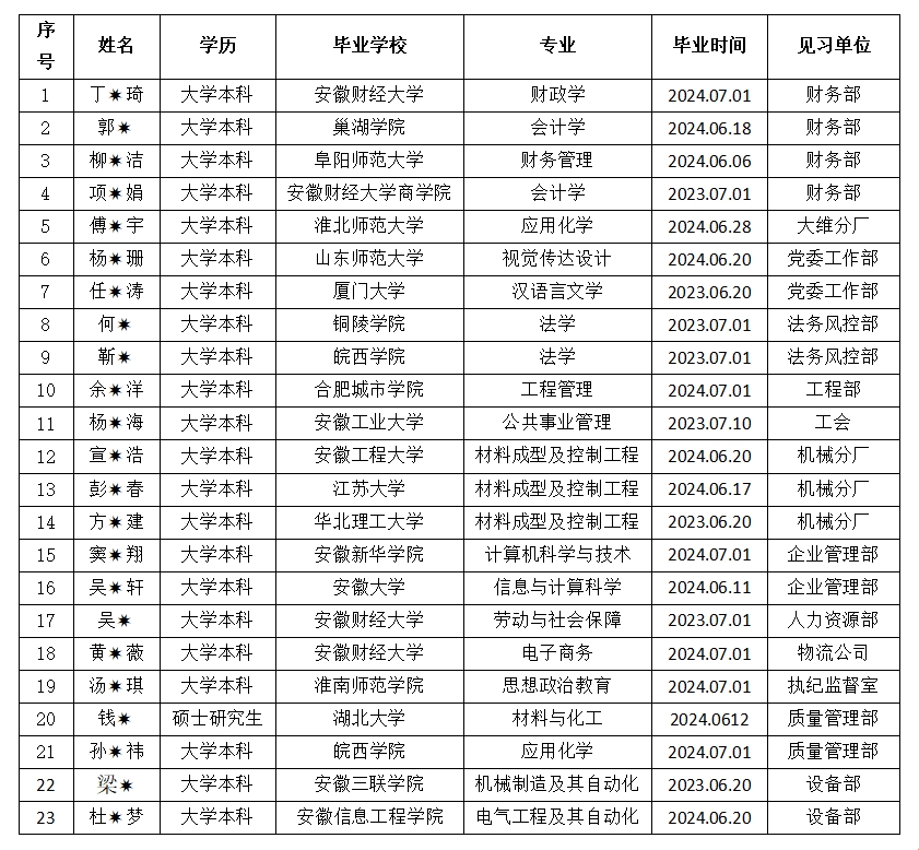 為認(rèn)真落實(shí)省國資委、省委宣傳部、省財(cái)政廳和人社廳《關(guān)于做好2024年安徽省國有企業(yè)就業(yè)見習(xí)工作的通知》(皖國資考分[2024]70號)精神,皖維集團(tuán)公開招募大學(xué)生就業(yè)見習(xí),經(jīng)公司相關(guān)單位篩選確定,23名見習(xí)生基本信息對外公示,公示期5天(2024年9月5日至9月9日),接受社會監(jiān)督。監(jiān)督電話:0551-82189867,0551-82189811。